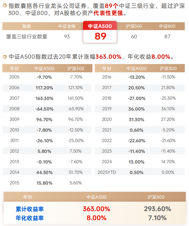 值得一提的是,中证A500指数本身就是一个长期表现亮眼的优质宽基指数,该指数过去20年的年化涨幅达到8%,优于同期的沪深300指数表现。
